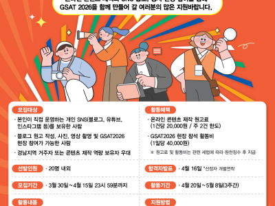 GSAT2026 서포터즈 모집온라인 콘텐츠 제작과 SNS 홍보, 행사 현장 참여를 통해GSAT 2026을 함께 만들어 갈 여러분의 많은 지원 바랍니다. ◎ 모집대상• 본인이 직접 운영하는 개인 SNS(블로그, 유튜브, 인스타그램 등)를 보유한 사람• 블로그 원고 작성, 사진, 영상 촬영 및 GSAT2026 현장 참여가 가능한 사람• 경남지역 거주자 또는 콘텐츠 제작 역량 보유자 우대 ◎ 선발인원• 20명 내외 ◎ 모집기간• 3월 30일 ~ 4월 15일 23시 59분까지 ◎ 활동내용• GSAT2026 관련 홍보 콘텐츠 제작 및 SNS 업로드– 카드뉴스, 릴스, 숏폼, 포스팅 등 자유형식• 개인 SNS(블로그, 유튜브, 인스타그램 등) 활용 주 2회 이상 홍보• GSAT2026 현장 참여(필수)– 행사 후기 및 홍보 콘텐츠 제작– 기타 현장 미션 등 ◎ 활동혜택• 온라인 콘텐츠 제작 원고료(1건당 20,000원 / 주 2건 한도)• GSAT2026 현장 참석 활동비(1일당 40,000원)※ 원고료 및 활동비는 관련 세법에 따라 원천징수 후 지급 ◎ 합격자 발표• 4월 16일 (*선정자 개별연락) ◎ 활동기간• 4월 20일 ~ 5월 8일(3주간) ◎ 지원방법1. GSAT2026 홈페이지 공지사항 확인2. 신청서 다운로드 및 작성3. 이메일 접수 (becom2026@naver.com)◎ 문의055-603-7101