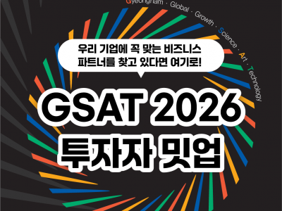 GSAT2026 투자자 밋업우리 기업에 꼭 맞는비즈니스 파트너를 찾고 있다면?GSAT2026 투자자 밋업!모집기간1. 23.(금) ~ 3. 10.(화)국내 주요 벤처캐피탈,액셀러레이터, 투자기관 등다양한 투자사들이 함께합니다✨ 우리 기업에 날개를 달아줄투자사를 GSAT2026에서 찾아보세요!GSAT2026 투자자 밋업 신청방법1️⃣ GSAT2026 공식 홈페이지 회원가입2️⃣ 메뉴 클릭 ▶ MEET UP 클릭 ▶투자자 MEET UP 신청 클릭3️⃣ 투자자 MEET UP신청서 작성 및 제출4️⃣ 신청 완료!투자자 ↔ 스타트업 매칭5️⃣ GSAT2026 행사장에서 만나요!투자 유치와 글로벌 진출 기회!GSAT2026 투자자 밋업에서 시작됩니다GSAT2026 투자자 밋업에 대한더 자세한 정보를 알고 싶다면?GSAT2026 공식 홈페이지에서확인하실 수 있어요!www.gsat.or.kr4. 29.(수) - 30.(목)창원컨벤션센터(CECO)